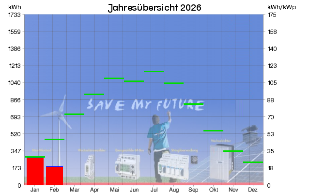 Monatsertrag: 185.0 kWh (18.7 kWh/kWp)